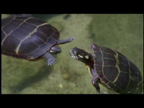 Newly-hatched painted turtles are in an underground nest in North America. It is late in the year and cold outside so if the hatchlings climbed out of their nest now they would find nothing to eat. Instead, they stay where they are. As winter comes, the temperature falls to -10 degrees and ice crystals form around - and inside - the babies. But their tissues are protected by a kind of anti-freeze. For six months the turtles remain in a frozen state that would kill any mammal or bird. When spring comes, the ice around and inside them melts, and they slowly come to life. It takes a while for them to be fully-functioning but eventually they are ready to dig themselves out of their nest and find the nearest pond. Meanwhile the parents are already preparing to breed again, with the male courting the female by gently strumming her cheeks with his long claws... and she responds.